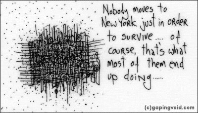 Mégis úgy érzem, az elkényeztetett és affektáló Woody Allen figura, vagy Dustin Hoffman tragikus Ratso alakja kell, hogy túléljen egy embertelen hajszát és közömbös elidegenedést ott, a karikatúra szerint.