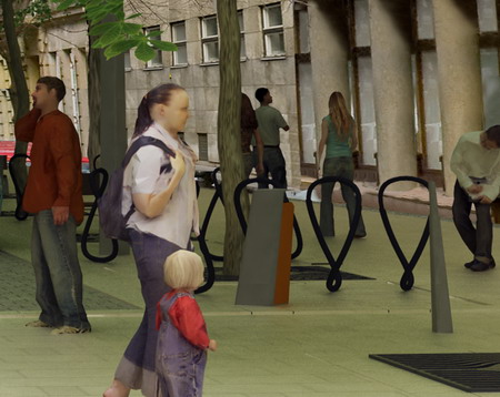 „A fő cél az volt, hogy ha ránézünk valamire, az keltsen bennünk asszociációt. Ilyen a kreatív, modern város.” - mondta Cselovszki Zoltán, a belváros főépítésze - Épp ezért a kerékpártároló egy földbe nyomott kör, mely egy nyolcast kapott biciklikerékre emlékeztet