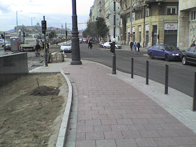 már régóta figyelem mit "alkotnak" a melósok itt a környéken és láttam hogy a belgrád rakpart havas utca utáni emelkedős részén az út jobb oldalán bordó kövekből rakják a járdát, míg a baloldalt szürkéből. aztán a napokban nekilendültek a srácok és tényleg valami bringás infrastruktúra épül, jó magyar szokás szerint.