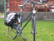 Mixte geometriájú, Cr-Mo ötvözetű 20-30 éves használt váz, 5 sebes régi kontrás agyváltó, Weiman első patkófék, 28x622-es sima gumik duplafalú felnivel, agydinamó az első kerékben állófényes Led/halogén mix-es lámpákkal. A hollandus stílusú kormány túl instabil volt, ezért maradtam az egyenes/kicsit görbített kormánynál, valamint egy kis dekás visszapillantó emeli a biztonságot. Nemrég a párom meglepett egy tigrises bringabag-os táskával, plusz kaptam egy alap km órát is, hogy tudjam mennyivel megyek.
