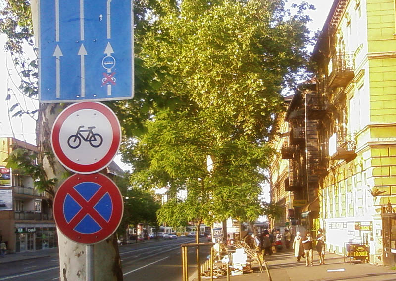 Egy szép bringatilossal "megoldott" közlekedési probléma, vagy inkább: mi történik, ha a megfelelő embernek kell(ene) időnként levennie a lábát a gézpedálról. A Hungária kereszteződése előtt és után, más okot nem tudok elképzelni, hiszen városszerte százával fordulnak elő ezzel azonos kereszteződések. Ez a tábla azt jelenti, hogy az 5, 7, 173, 7E, és 173E buszok nem éppen kis forgalmú, kb 3 méter széles megállóján át vezet a mintapolgárok szabálykövető kerékpártoló útvonala, néhány boldog autóvezető tekintetével kísérve, a belváros kapujában, 2010-ben. Egyébként a táblát a szembe irányban is kitették a vasúti híd alá, ahol a sáv folytatásában még buszforgalom sincs.