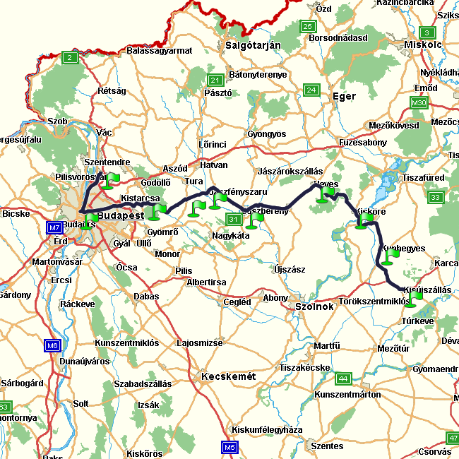 Dunakeszi - Budapest - Isaszeg - Zsámbok - Jászfényszaru - Jászberény - Jászapáti - Heves - Kisköre - Kunhegyes - Karcag/Kisújszállás