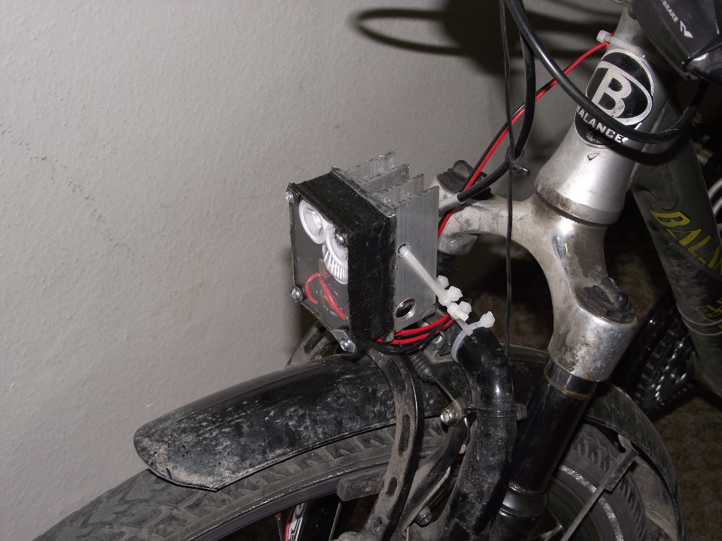 Sok tervezes, viszonylag sok kezugyesseget igenylo munka utan van egy egesz jo lampam, ami nem tul szep, gyalogos temponal villog, de 15km/h kornyeken mar stabil es eros fenye van... Az alapanyagar az elso kerek nelkul valahol 5000-6000Ft kozott van.