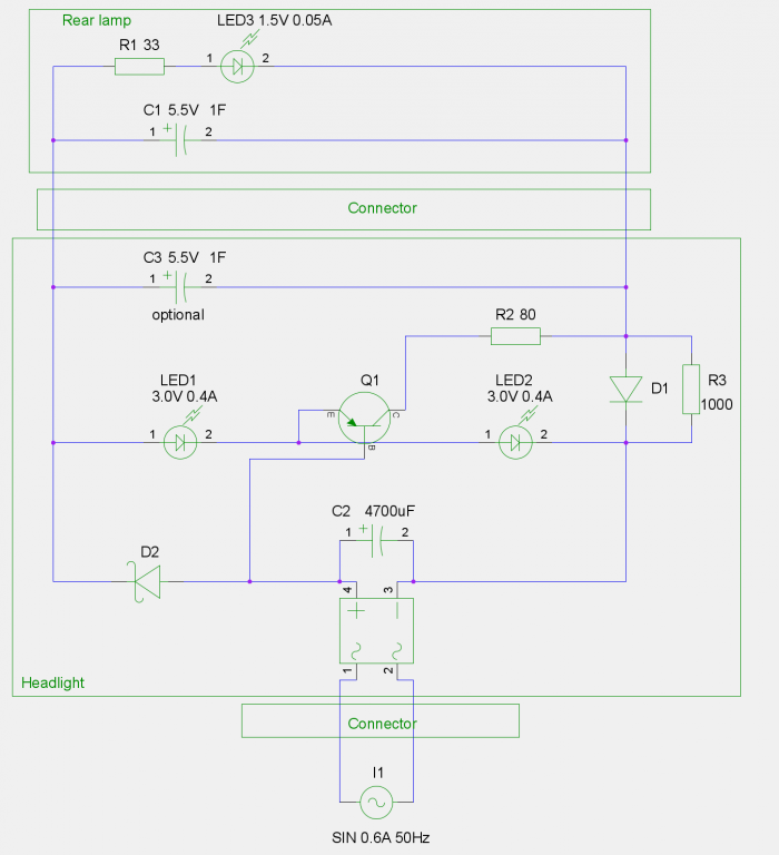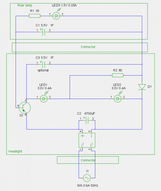 Az elektronika tobbi reszere a kovetkezot gondoltam: Egy egyeniranyitoval egyeniranyitok, teszek ra egy simito kondit 4700uF-dal, hogy kis sebessegnel ne villgojanak a ledek. Sorba kotom a 3 powerledet, az elsovel parhuzamosan kotok egy 1F-os supercap-et es a hatso lampat. Nem tudtam pontosan modellezni ezt a parhuzamosan kotott rendszert, ezert biztos ami biztos alapon kapott meg egy kis 3ohmos ellenallast a powerled (igy a hatso lampa biztosan kap eleg feszultseget...)