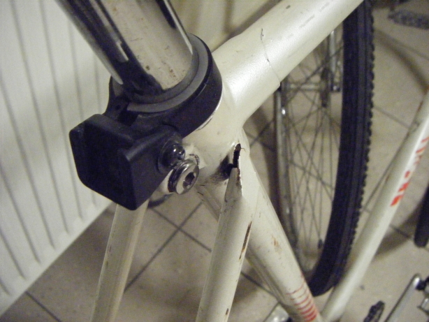 Azt vettem észre ma, hogy el van törve a támvillám. Az illesztést ette meg a rozsda a nyeregcsőnél. A bicó egy régesrégi alpina váz, egysebinek összerakva, csak a városban futkároztam vele, nem volt különösebb igénybevételnek kitéve.