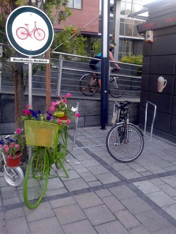 Tegnap hosszú idő óta újra jártam feléjük, és megdöbbenve tapasztaltam, hogy a tárolókat a járda szintjén jelentősen tovább bővítették, és mellé dizájnos kerékpár virágtartókat helyeztek ki, és több helyen egy szellemes "WestEndezz biciklivel" táblával (lásd kép) is jelzik elkötelezettségüket. (Egy bringával behajtani tilos tábla van úgy átköltve, hogy piros helyett zöld körben van a bringa.) tovább »