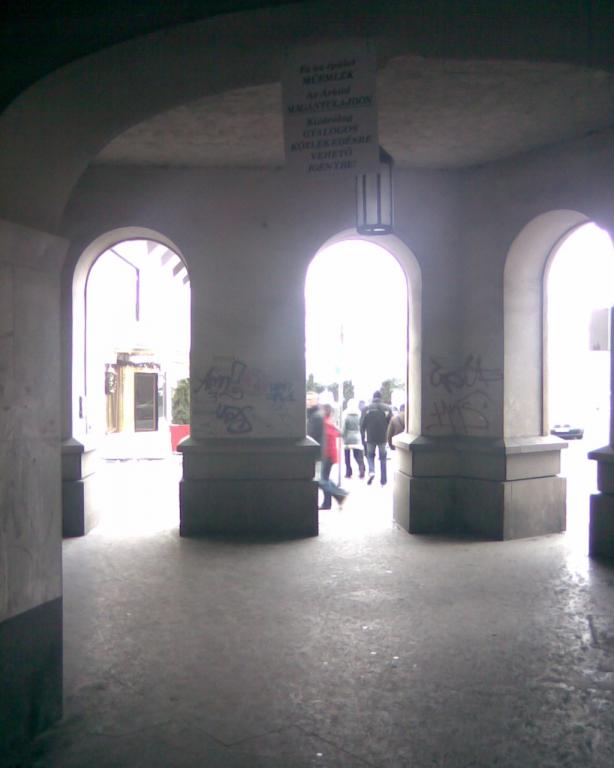"Ez az épület MŰEMLÉK Az Árkád MAGÁNTULAJDON Kizárólag GYALOGOS KÖZLEKEDÉSRE VEHETŐ IGÉNYBE!"