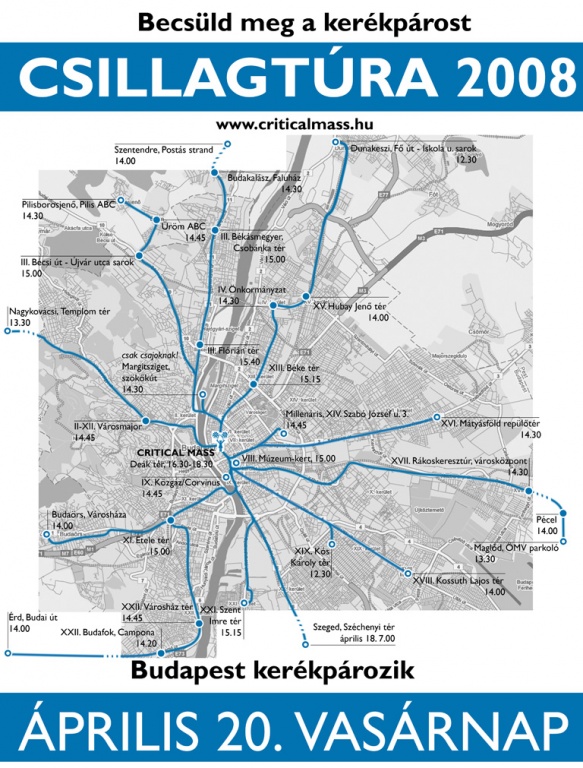 A csillagtúra lényege, hogy a Critical Mass kiindulópontjához (ápr. 20., 16:30, Deák tér) szervezett menetek indulnak a város különböző pontjairól. Ez azért nagyon jó, mert így sokkal több közös vonulós, mosolygós élmény jut mindenkinek. Találkozhatnak az egy helyen élők, és ha olyan a szervezés, lehet, hogy még az önkormányzatnak is megmutathatjátok magatokat! A menetekbe családdal kapcsolódók biztonságosabban közelíthetik meg a startot, és ami a legnagyobb, ellepik Budapestet a bringások!