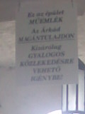 "Ez az épület MŰEMLÉK Az Árkád MAGÁNTULAJDON Kizárólag GYALOGOS KÖZLEKEDÉSRE VEHETŐ IGÉNYBE!"