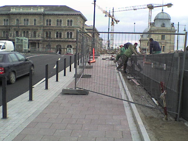 már régóta figyelem mit "alkotnak" a melósok itt a környéken és láttam hogy a belgrád rakpart havas utca utáni emelkedős részén az út jobb oldalán bordó kövekből rakják a járdát, míg a baloldalt szürkéből. aztán a napokban nekilendültek a srácok és tényleg valami bringás infrastruktúra épül, jó magyar szokás szerint.