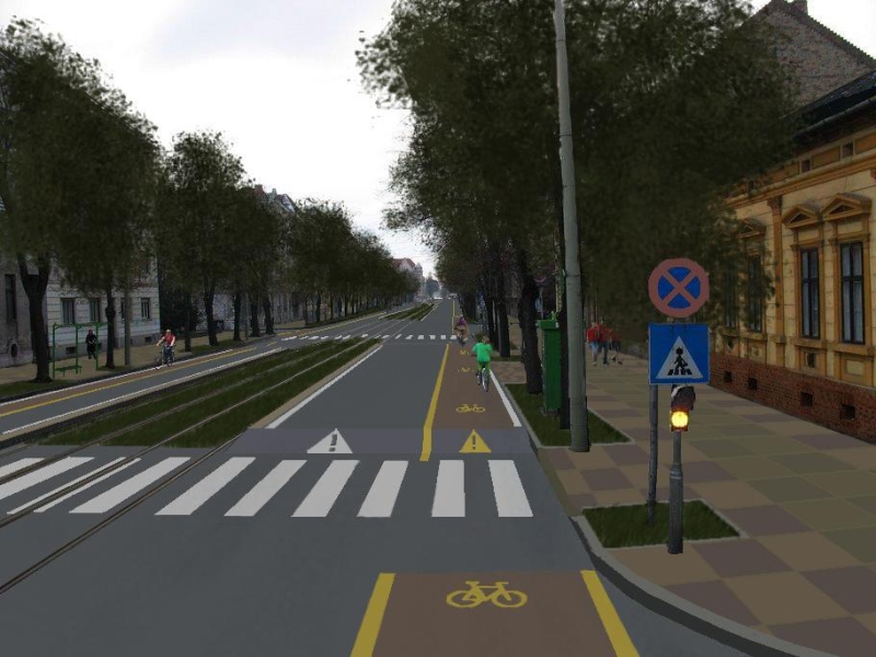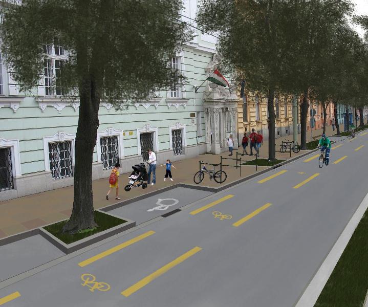 És javaslatokat adott. Parkolók megszüntetése merült föl, aztán az odébbhelyezésük a fák közé parkolóöblökben aszfalttal, vagy gyepráccsal. így a kerékpárosoknak kerékpársáv lehetett volna az úttesten. Mind el lett vetve. Először azért, mert nem szabad elvenni a parkolókat, meg mert sokba került volna a szegélykorrekció. Aztán azért, mert az öblök kialakításánál a fák gyökereinek egy része meg lett volna sértve. Végül az irányhelyes vezetéses javaslatból nyomokban tartalmazván egy olyan megoldás alakult ki, hogy kétoldali egyirányú kerékpárút készüljön szintben elválasztva, „K-szegéllyel”, a járdákból elvéve. Ez szintén szegélykorrekcióval jár, a járdák és a bicikliút totális újraaszfaltozásával, alapozással, és mint most kiderült a fagyökerek elnyiszálásával.