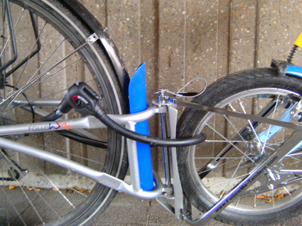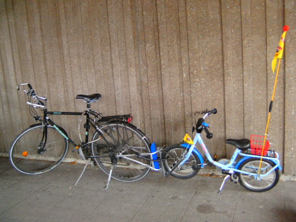 A következő megoldást láttam/fényképeztem ma. Számomra ez teljesen új dolog volt. Előnye, hogy a gyerek a saját bringáján ül, az mégis biztonságosan hozzá van erősítve apa/anya kerékpárjához. De a képeken ez jobban látszik.