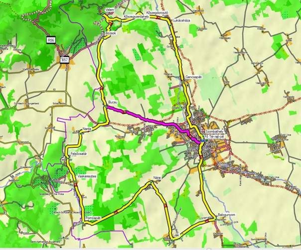 Rossz idő, sérülés, vagy fáradtság esetén az útvonal egyénileg rövidíthető Bucsuról egyenesen Szombathelyre tekerve, így a táv ~60 km (lila színnel jelölve).