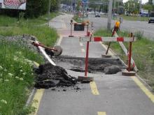 azon a szakaszon, ahol beszakadt, ott az pont a bringaút egyik "sziget-részén" van, egy olyan helyen, ahol a négy sávos főútról ki és be lehet kanyarodni egy nagyobb telephelyhez (2-2 ki és behajtási lehetőség van) ott nem érdemes levágni, inkább utána. Az autó is azon a szakaszon van + elég régóta látszott, hogy be fog szakadni ott az út.