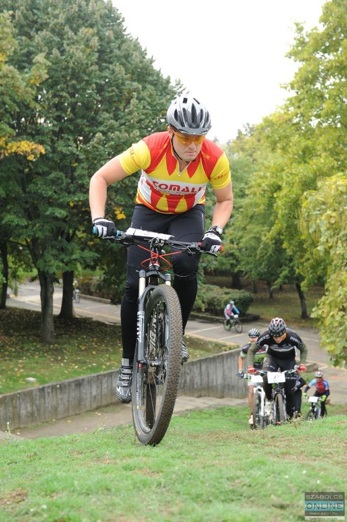 Amikor elindultunk egyből egy emelkedővel kezdtünk ott a tumultusban nem nagyon akartam zavarni senkit, hiszen más eredményét nem akarom elrontani, de ez attól még nem azt jelenti, hogy nem adtam volna bele mindent. Majd kanyar-kanyart követ. Konstatálom, hogy nicsak ez a rövid stucni dolog annyira nem butaság. Frenki Fuji-ján már éreztem, hogy a rövid stucni milyen virgoncságot eredményez, de ott betudtam annak, hogy 26-os. Igen de a 90-es stucni is érezhetően fürgébb főleg egy 570-es kormánnyal. Így fűzögettem le a köröket egymás után amikor talán a 3. körömön a második kanyarban leesett a láncom, bazd meg más sem hiányzott. Nem baj váltóval gyorsan visszapakoltam, így még a kezem sem lett koszos, majd BéZsé, mint kommentátor kis lökéssel segített tovább indulni. Ebben az ütemben folytattam a versenyt, amikor is az 5.-6. kör körül talán megelőztem Szeman Attilát és sikerült is tartanom az előnyöm, majd egyik mászás közben a kölcsön paripa megtáltosodott és alig tudtam a földön tartani az első kerekem, miközben Sotkó Tamás ott volt közvetlen mellettem, szegényt majdnem le is szorítottam, és ezt fentről persze szándékosnak érezték, hol ott tényleg a bénaságom volt rá a magyarázat.